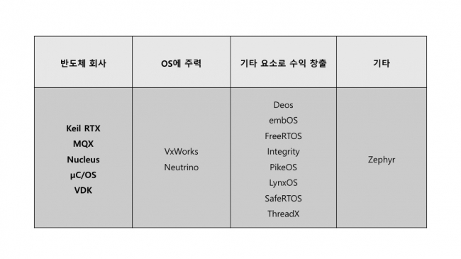 링스 소프트웨어 테크놀로지의 보고서에 따르면, RTOS 제공업체는 크게 수익 창출 방식에 따라 4가지 ▲반도체 회사 ▲OS로 주수익을 창출하는 회사 ▲툴과 같은 다른 시스템 요소로 수익을 창출하는 회사 ▲기타로 분류할 수 있다.