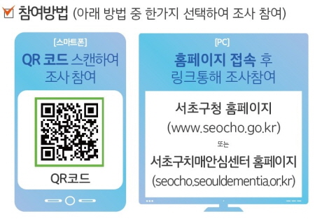 이번 조사는 서초구청·서초구치매안심센터 홈페이지 내 링크에 접속하거나 설문조사 전에 우편으로 발송된 안내문의 QR코드를 스캔해 참여할 수 있다. 온라인 조사에 참여하지 못한 경우 방문 조사를 진행할 계획이다. 조사는 약 15분가량 소요되며, 문항은 치매에 대한 지식, 태도, 예방 활동 참여 정도, 앞으로 하고 싶은 치매 예방 활동 등에 대한 내용으로 구성돼 있다.