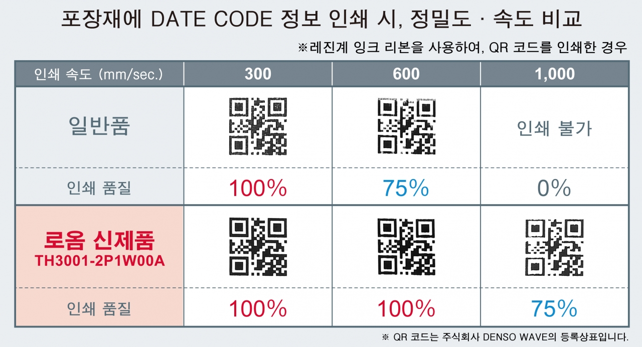 [테크월드=선연수 기자] 로옴(ROHM)이 식품 포장이나 물류 등의 날짜 코드(DATE CODE) 정보를 환경 배려형 인쇄 매체로 기록하는 서멀 프린트 헤드 'TH3001-2P1W00A'를 개발했다.