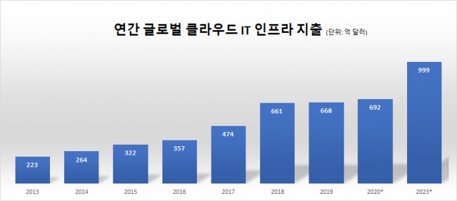 시장조사기관 IDC(International Data Corporation)도 2020년 클라우드 예상 IT 인프라 지출은 692억 달러로 2019년에 비해 3.6% 증가할 것이라고 전망했다. 이에 반해 비클라우드 IT 인프라에 대한 지출은 2020년 614억 달러를 기록할 것이라고 예측했다. 이는 2019년에 비해 9.2% 감소한 수치다. 이로써 전체 IT 인프라에 대한 지출은 1306억 달러를 기록할 것으로 예상했다. 이는 특정 지역에 국한되지 않고, 세계 모든 지역에서 공통으로 나타나는 양상이다.