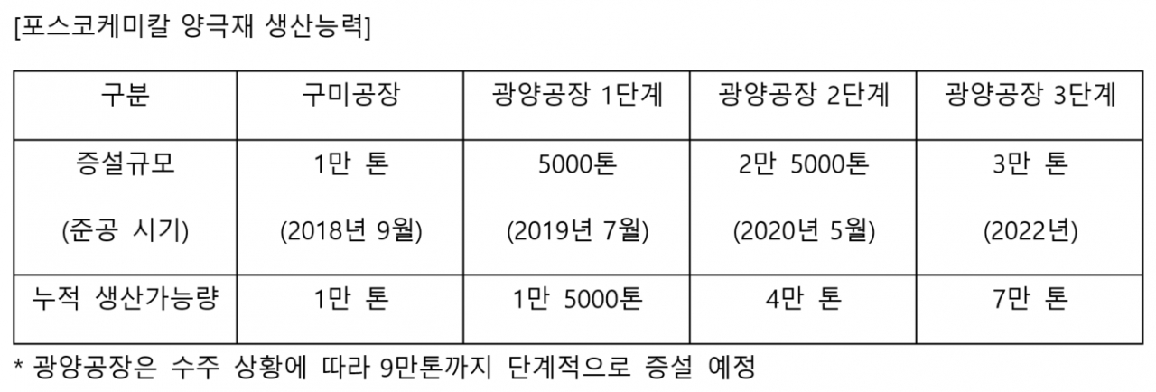 이는 양극재 광양공장의 3단계 확장을 위한 것으로, 9월 공사를 시작해 2022년 가동을 목표로 한다. 증설이 완료되면 포스코케미칼은 양극재 생산능력을 기존의 연산 4만 톤을 포함해 7만 톤으로 확대하게 된다. 양극재 7만 톤은 60Kwh급 전기차 배터리 84만여 대에 사용될 수 있는 양이다.