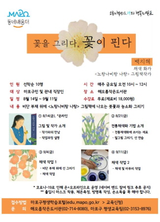 오는 14일에 첫 개강하는 '꽃을 그리다 꽃이 핀다' 프로그램은 수강생 10명을 선착순으로 모집해 전통 채색화를 배우고 비단부채에 직접 꽃 그림을 그리는 과정이다.