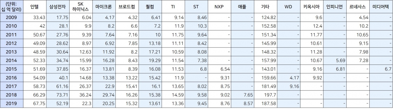 작년 한 해 인텔과 삼성의 뒤를 이은 반도체 기업은 SK하이닉스로, 223억 달러의 매출을 달성했다. 이어 마이크론이 202.5억 달러, 브로드컴이 153.2억 달러, 퀄컴이 136.1억 달러, 텍사스 인스트루먼트(TI)가 133.6억 달러, ST마이크로일렉트로닉스가 94.5억 달러, NXP 반도체가 87.6억 달러, 애플이 85.7억 달러의 매출을 기록했다.