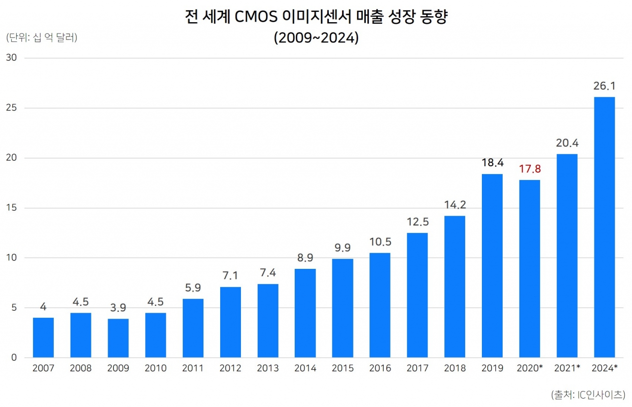 IC 인사이츠(IC Insights)에 따르면, 올해 CMOS 이미지센서 매출은 총 178억 달러로 떨어질 것으로 예상된다. 2009년 이래로 지속적으로 성장세를 이어오던 CMOS 이미지센서 시장은 올해 코로나19의 영향으로 작년 대비 매출이 4% 감소할 것으로 보인다. 그러나 2021년에는 다시 매출이 15% 증가해 2024년까지 꾸준히 시장 규모를 넓힐 것으로 전망된다.