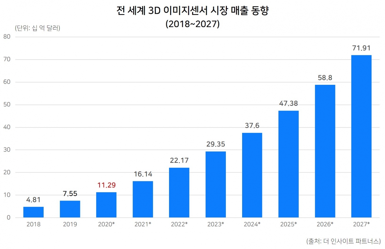특히, 3D 이미지센서 시장은 자율주행, 스마트폰, 사물인터넷(IoT)과 같은 고도화된 기술 제품에 필수적으로 적용됨으로써 시장 규모가 가파르게 증가할 것으로 예상된다. 더 인사이트 파트너스(The Insight Partners)에 따르면, 3D 이미지센서 시장은 2019년 75억 5000만 달러의 매출을 기록했으며, 올해 매출은 112억 9000만 달러에 이를 것으로 예상된다.
