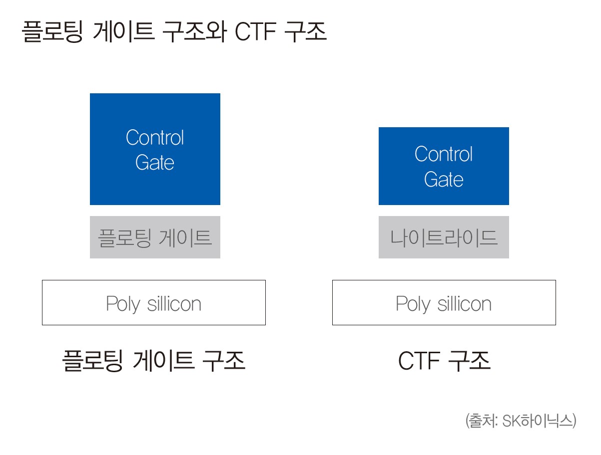 적층에 사용되는 3D 낸드 플래시 증착 기술은 ‘CTF’ 낸드 플래시 기술이라고 불린다. 이는 기존에 사용되던 도체 플로팅게이트(Floating Gate)를 부도체인 CTF가 대신하는 기술이다. 이 CTF를 적층하고 구멍을 뚫어 전하를 채워 넣는 방식으로 데이터를 기록한다.