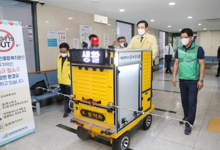 이동진 구청장은 8월 19일, 도봉 장애인종합복지관을 방문해 'K-방역차'를 직접 운전하며 '코로나19' 방역 활동에 나섰다.
