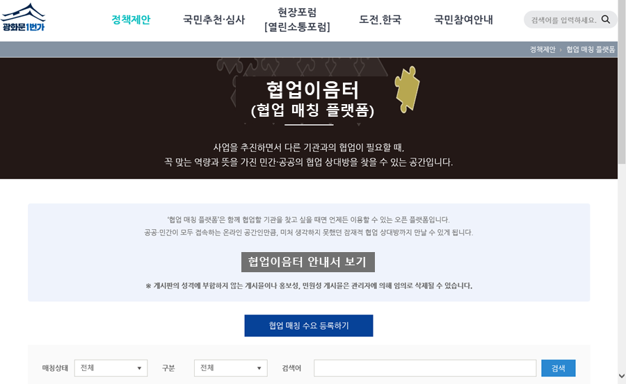 협업이음터는 사업을 추진하면서 다른 기관과의 협업이 요구될 때, 필요한 역량(자원)과 뜻을 가진 협업 상대방을 폭넓게 찾을 수 있는 온라인 공간이다. 중앙행정기관·지방자치단체·공공기관 등 공공부문은 물론, 민간의 단체·협회·기업 등도 활발히 이용할 수 있도록 지난 6월 19일 ‘광화문1번가’에 개설됐다.