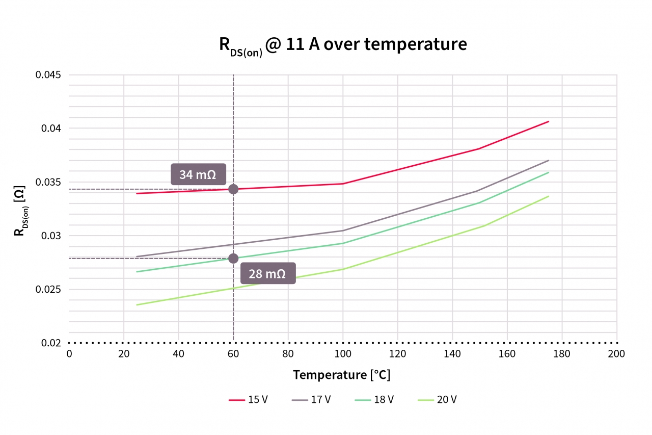 SiC로 전환해도 기존 Si 디바이스에 사용되는 것과 같이 최대 15V에 이르는 게이트 구동 전압을 발생시키는 동일한 드라이버를 사용할 수 있다. 그러나 사용되는 게이트 구동 전압에 따라 RDS(on)도 영향을 받기 때문에, 이와 관련해 약간의 변경이 요구될 수 있다. CoolSiC MOSFET은 0~18V의 게이트 구동 전압을 사용할 수 있어 15V 사용 대비 60℃에서 RDS(on)을 18%까지 낮출 수 있다[그림 1].