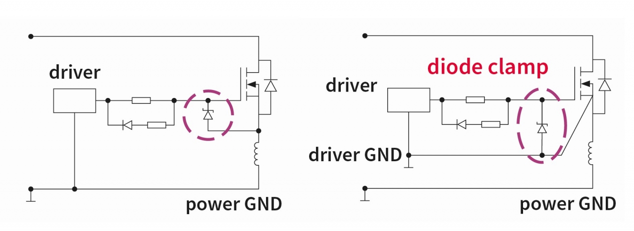 그러므로 스위치의 게이트와 소스 사이에 클램핑 다이오드를 사용하는 것이 좋다. 이를 통해 게이트로 인가되는 음의 전압을 -2V 이상으로 제한함으로써 디바이스를 VGS(th) 드리프트로부터 보호할 수 있다.