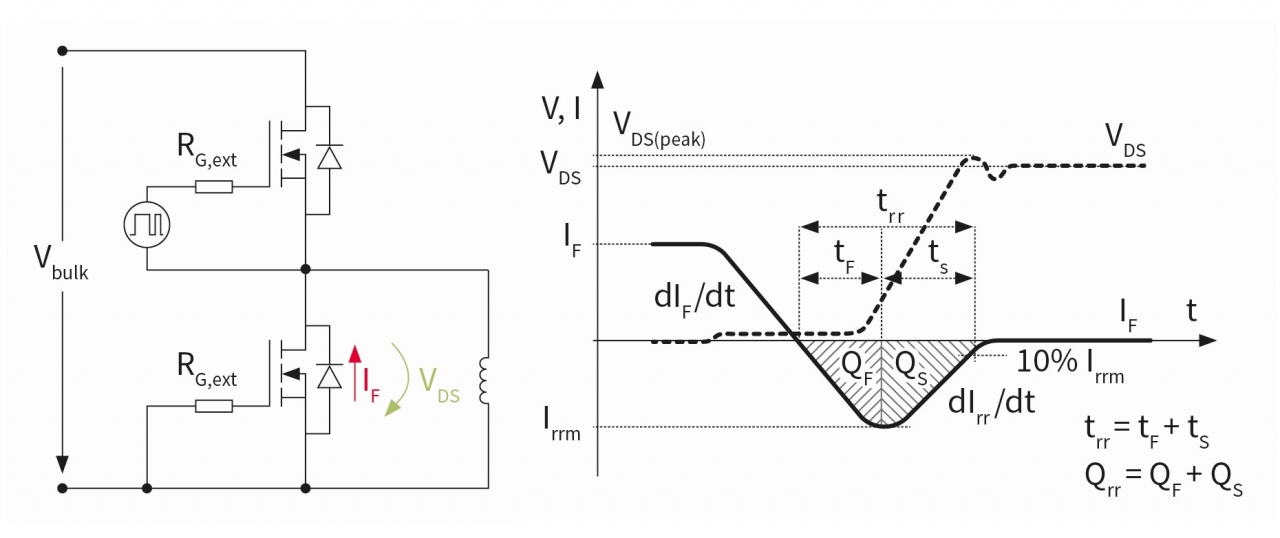 역 복구 전하(Qrr)는 공진 토폴로지나 전도 바디 다이오드로 연속적 하드 정류를 사용하는 디자인에서 특히 중요하게 고려해야 할 파라미터다. 모든 MOSFET은 내부에 바디 다이오드를 포함하고 있으며, Qrr은 전도를 멈춘 후 다이오드부터 제거해야 할 전하를 말한다[그림 3].