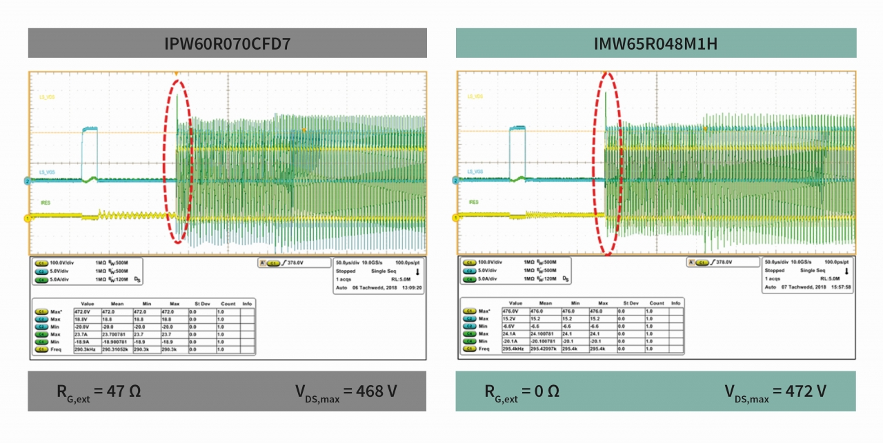 CoolMOS 스위치를 사용할 때 이 문제를 극복하기 위해서는 게이트로 저항(RG)을 사용해 스위칭 속도를 낮춰야 한다. 이렇게 하면 드레인-소스로 요구되는 80% 디레이팅(De-rating) 달성에 도움 된다. 대신, RG를 삽입하면 전류가 증가해 특히 턴오프 시 스위칭 손실을 늘린다는 단점이 따른다.