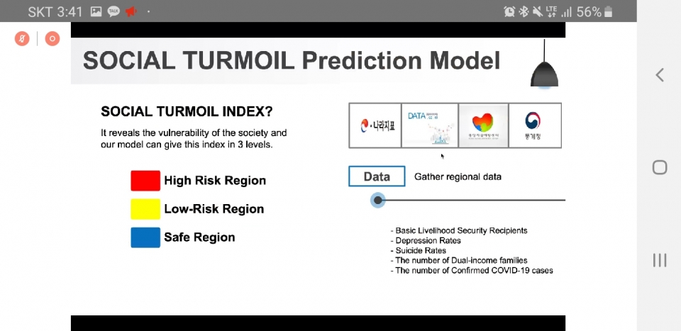 코로나19 자가진단·건강정보를 제공해주는 ‘HAND DOCTOR 앱’, 공공데이터를 활용해 코로나19 관련 맞춤형 복지정보를 알려주는 ‘SSOK 앱’ 등 생활밀착형 서비스 외에도 ‘코로나19 확진자 수’와 ‘지역별 위험군 데이터’를 활용해 사회 혼란도를 예측하는 분석모델 등 참신한 아이디어를 선보였다