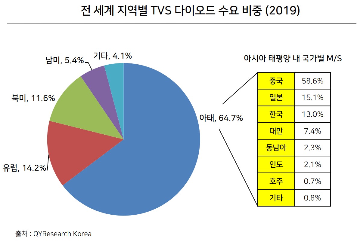 지역별 TVS 다이오드 소비 시장은 2019년 기준 아시아·태평양지역이 64.7%로 가장 큰 비중을 차지했고, 유럽(14.2%)과 북미(11.6%)가 뒤를 이었다. 아태지역 내에서는 중국이 58.6%, 일본 15.1%, 한국 13.0% 등의 비중을 나타냈다.