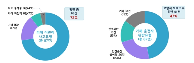 점검 결과, 교통사고 다발지역에서 피해 어린이 10명 중 7명이 횡단 중 사고를 당했고, 가해 운전자 10명 중 5명이 보행자 보호의무를 위반해 사고가 발생한 것으로 분석됐다.