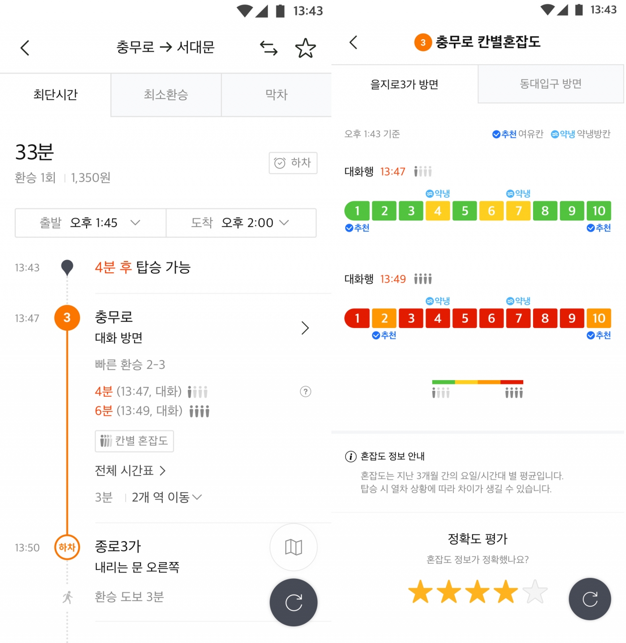 T맵 대중교통 앱에서는 초록, 노랑, 주황, 빨강의 색깔로 표시되는 칸별 혼잡도 단계를 확인할 수 있다. 초록은 칸 내 승객이 여유로운 상태, 빨강은 승객의 어깨가 밀착돼 이동하기 어려운 상태를 나타낸다. 모든 칸이 같은 혼잡도일 경우, 조금이라도 더 여유있는 2개의 칸을 알려주는 '추천' 기능도 도입했다.