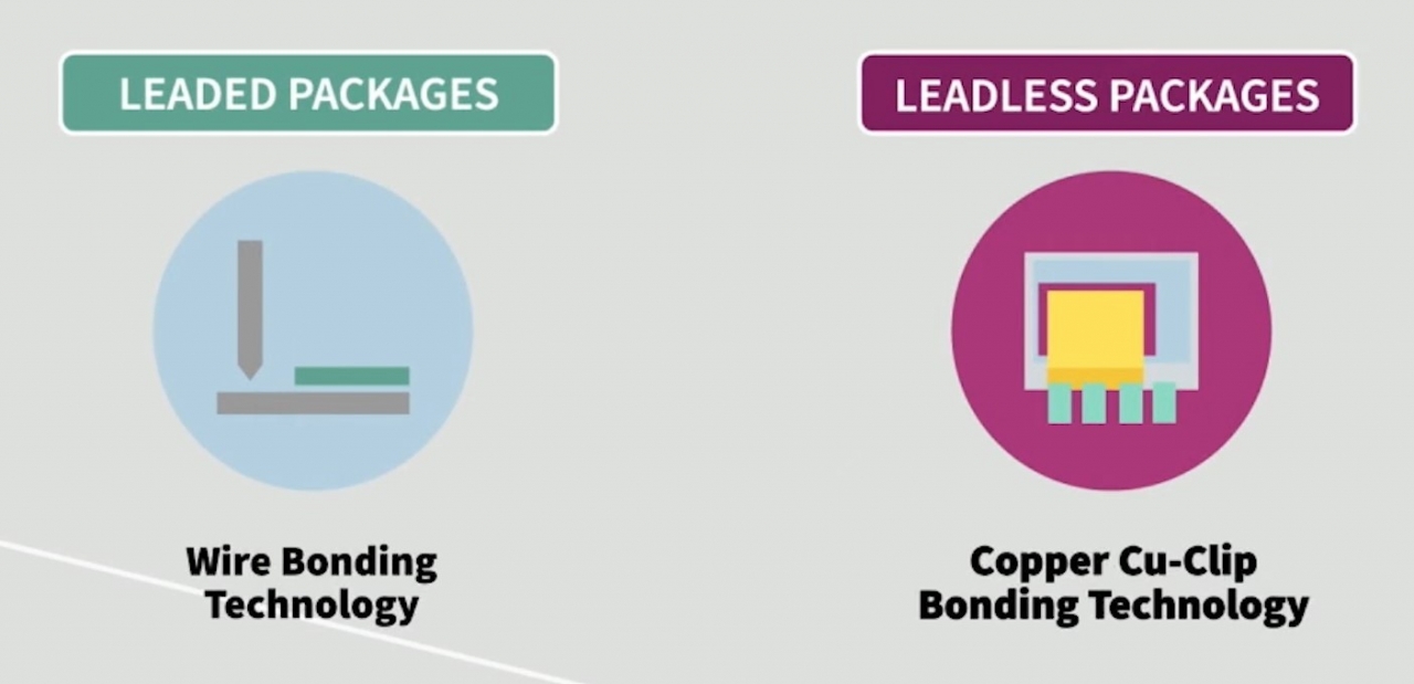 패키지로는 리드 패키지(Leaded package)와 리드리스 패키지(Leadless package)를 살펴볼 수 있다. 먼저, 리드 패키지는 기존의 와이어(Wire) 본딩(Bonding) 기술을 사용하는 것이다. 리드리스 패키지는 구리 클립(Cu-Clip)의 본딩 기술을 사용하는데, 이 구리 클립이 와이어 본딩보다 접촉 면접이 더 넓어 더 높은 전류 성능을 달성한다. 이는 솔리드 구리 브리지가 칩 상단에 부착돼, 여러 개의 본딩 와이어를 대체하는 방식이다.