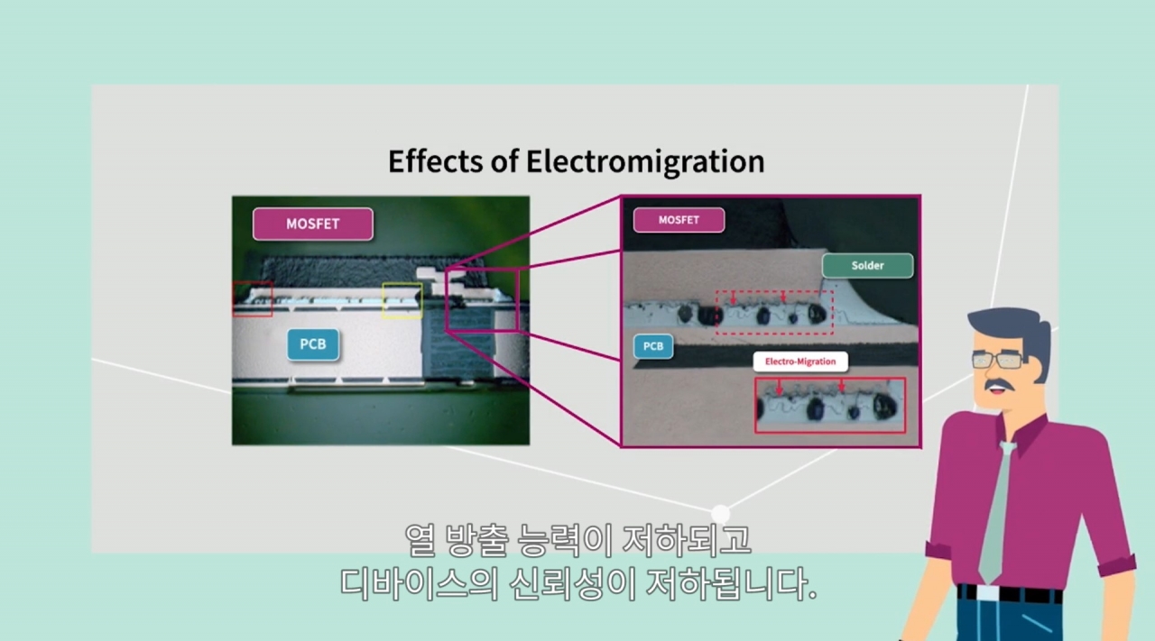 또 하나 고려할 점은 일렉트로마이그레이션(Electromigration) 효과다. 이 현상은 움직이는 전자의 운동량이 가까운 원자로 전달될 때 발생하는데, 이로 인해 납땜에 불량 조인트와 보이드가 발생하고 열 방출 능력이 낮아져 디바이스 신뢰성에도 영향을 주게 된다. 이는 단방향으로 고전류가 흐르는 배터리 스위치와 같은 애플리케이션에서 신뢰성 문제에 더 큰 영향을 끼친다. 이와 같은 일렉트로마이그레이션 현상으로 인한 손상을 방지하기 위해서는 전류 밀도를 제한해야 한다.