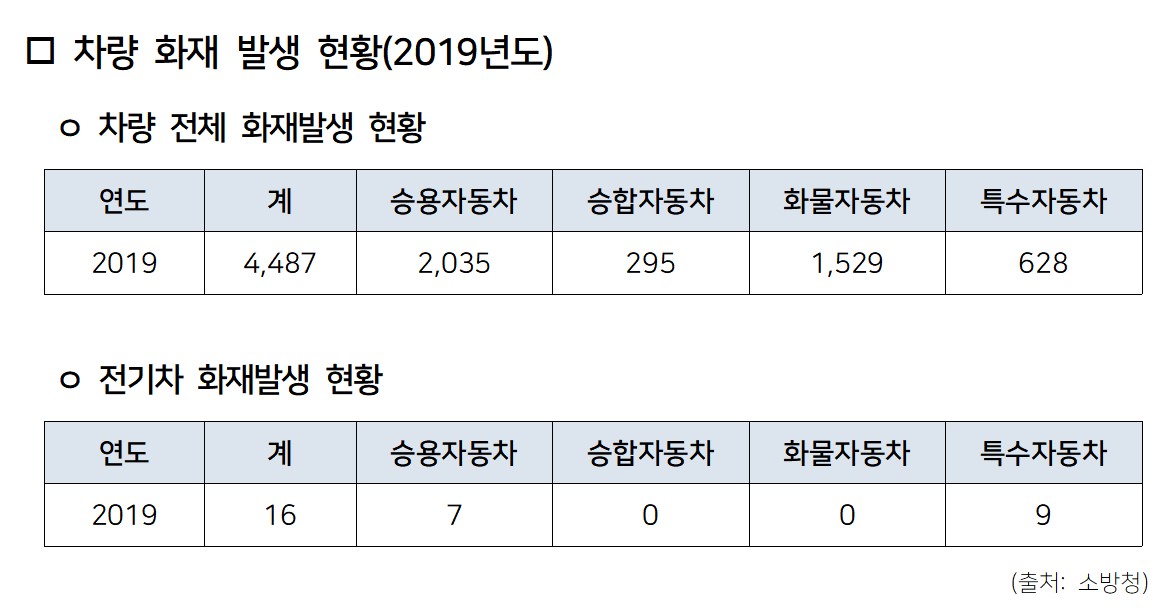 소방청은 작년 한해 전기차 전체 차량 대수 대비 화재사고율이 0.02%로 전체 차량 화재사고율인 0.02%과 비슷하다고 밝혔다. 이에 따라 전기차가 화재위험이 더 높은 것은 아니지만, 소방대원이 현장활동을 할 때 위험 여지가 있는 고압 전류로 인한 2차 피해를 예방하는 조치가 필요하다고 설명했다.