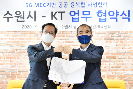수원시와 KT는 9월 22일 오후 수원시 광교웰빙체육센터에서 조무영 수원시 제2부시장과 KT AI/DX융합사업부문장 전홍범 부사장이 참석한 가운데 5G MEC기반 공공장소 비대면 방역·교육 사업 업무협약을 맺었다고 밝혔다.