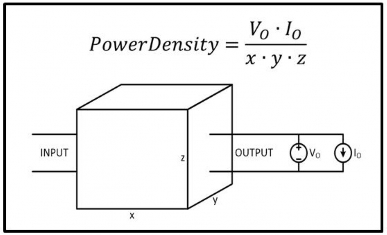 전력 관리 분야에서 전력 밀도(Power density)는 간단하게 [그림 1]과 같이 컨버터의 정격(또는 공칭) 출력 전력을 컨버터가 차지하는 부피로 나눈 값으로 정의할 수 있다.