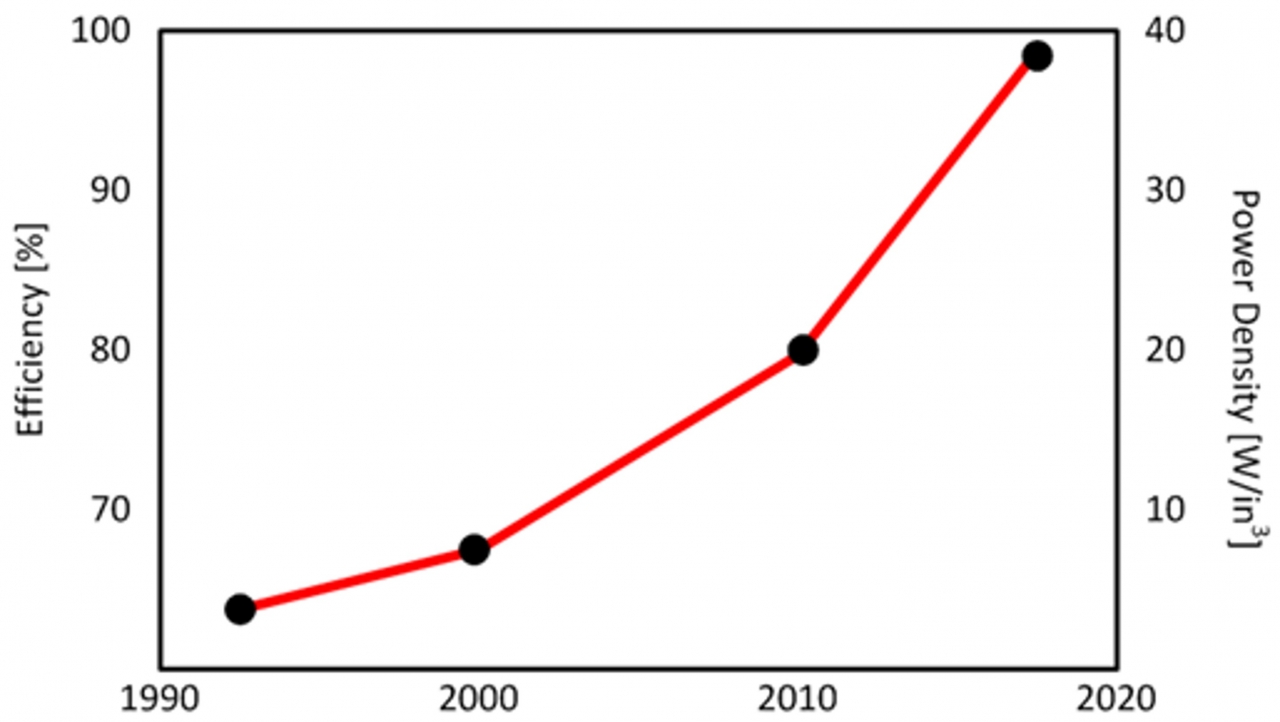 1990년대 초부터 개인 컴퓨팅과 전자기기, 이동통신, 반도체 기술 발전에 힘입어 효율성을 개선하자는 요구에 가속도가 붙었다. [그림 2]에서 설명한 바와 같이 전력 솔루션의 효율성 증가는 전력 밀도의 지속적인 발전을 촉진시켰다.