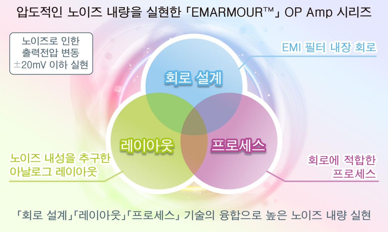 이로 인해 센서 등 미세 신호를 출력하는 디바이스의 후단에 설치할 시, 외부 노이즈와 부하 용량의 영향을 받지 않고 고속으로 신호를 증폭할 수 있다. 2ch 제품이므로 소형화 설계와 동시에 어플리케이션의 설계 공수 삭감과 고신뢰성화에 기여한다.