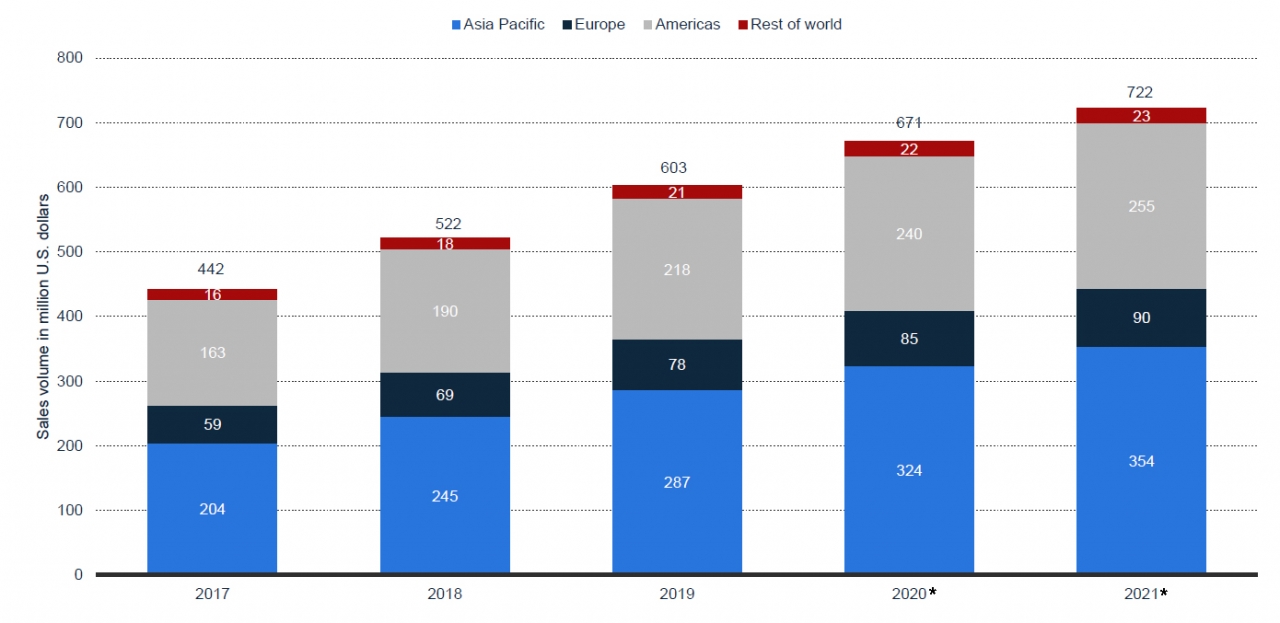그래프에서 알 수 있듯, 엔터테인먼트와 레저 로봇의 시장점유율은 아시아태평양과 미주 지역이 매우 높다. 특히 아태지역은 해를 거듭할수록 그 볼륨이 점차 커질 전망이다.