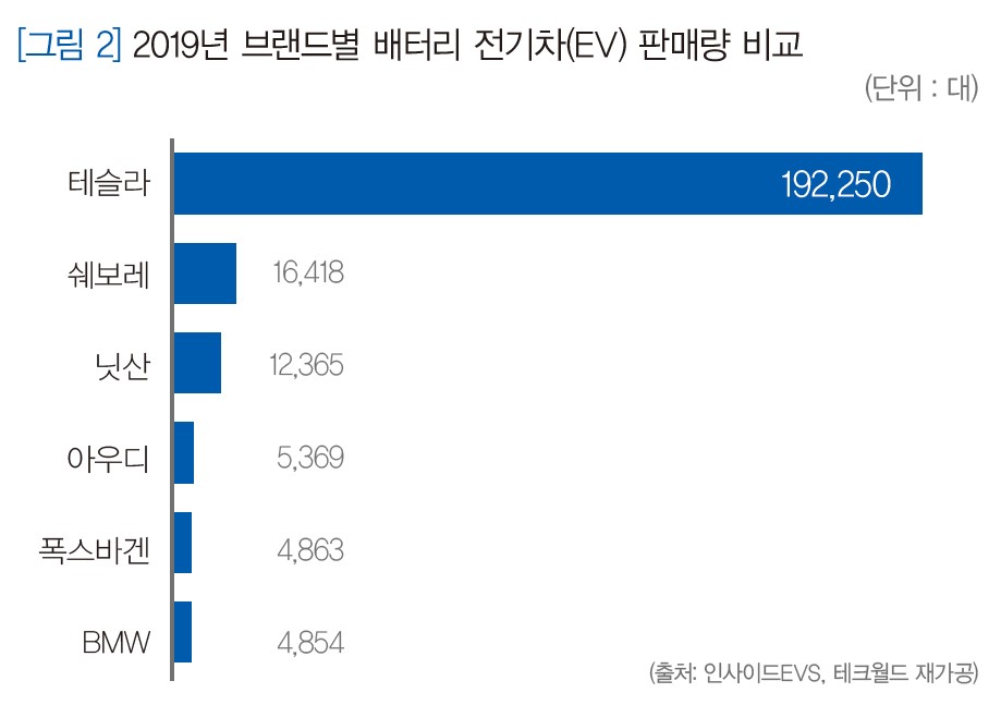 인사이드EVs(INSIDEEVs)에 의하면, 테슬라가 2019년 미국 배터리 구동 전기차 시장에서 19만 2250대의 전기차를 판매했고, 이는 2위를 기록한 쉐보레(Chevrolet)의 판매량이 1만 6418대에 비하면 압도적인 수량이다[그림 2]. 작년 테슬라는 2조 2000억 달러의 총 매출을 기록했고, 총 이익은 165억 달러를 달성했다. 친환경을 위한 전기차, 운전자 편의를 위한 자율주행 두 분야에서 우수한 기술력으로 시장 우위를 점하는 테슬라의 대항마는 적어도 2025년까지는 없을 것으로 업계 전문가들은 전망하고 있다.