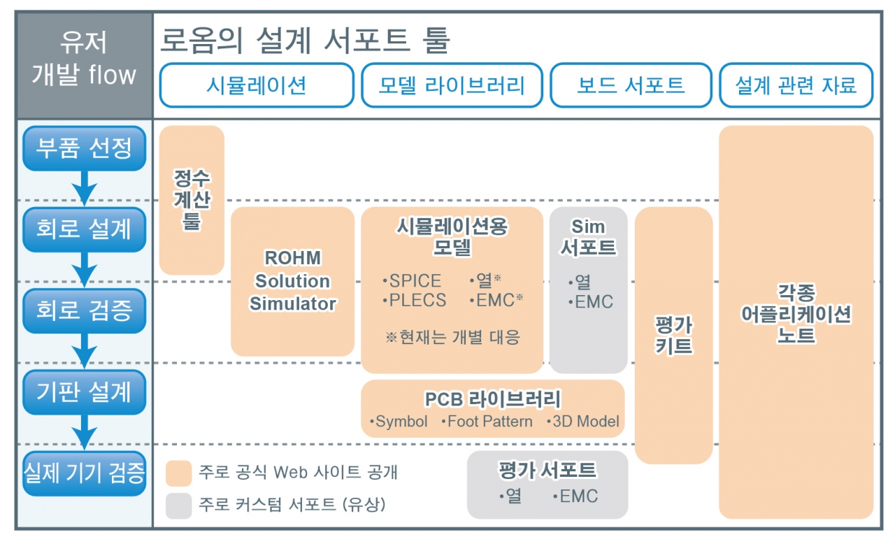 로옴도 지금까지 시뮬레이션을 통해 제품의 전기적 특성을 충실히 재현하는 SPICE 모델, 발열 현상·방열 효과를 유체해석으로 검증하는 열 설계 서포트 등 각 개발 단계에서 과제 해결에 기여할 수 있는 다양한 솔루션을 제공해왔다. 최근에는 자동차·산업기기 분야용으로 대전력을 공급하는 파워 디바이스 제품과 파워 디바이스를 구동하는 IC 제품의 성능을 최대한으로 발휘하도록 돕는 애플리케이션 회로 개발·서포트에도 주력하고 있다. [그림 1]은 로옴이 개발 단계에 따라 제공할 수 있는 툴과 서포트를 도식화한 것으로, 이에 대해 하나씩 살펴본다.