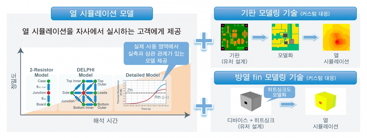로옴은 이를 사전에 회피할 수 있도록 ‘열 시뮬레이션용 모델’을 제공한다. 사용자는 이 모델을 통해 열 시뮬레이션을 간단하게 실시할 수 있다[그림 2]. 기판과 방열 핀(fin) 등을 모델링할 수 있는 기술을 보유하고 있어, 애플리케이션에 적합한 열 설계 노하우와 개선 대책을 제안할 수 있다.