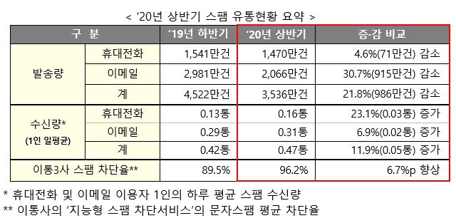 이번 조사결과에 따르면, 2020년 상반기 전체 스팸 발송량은 3536만 건으로 2019년 하반기(4522만 건) 대비 21.8% 감소하고, 1인 일평균 스팸 수신량은 0.47통으로 2019년 하반기 대비 0.05통 증가했다. 이통사 평균 스팸 차단율은 96.2%로 2019년 하반기 대비 6.7%P 향상된 것으로 나타났다.