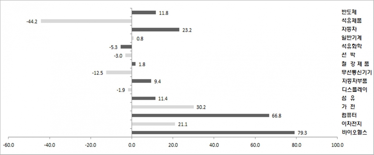 15대 주요 품목 중 ▲반도체 ▲일반기계 ▲자동차 ▲차부품 ▲철강 ▲컴퓨터 ▲바이오헬스 ▲이차전지 ▲섬유 ▲가전의 10개가 플러스를 기록했다.