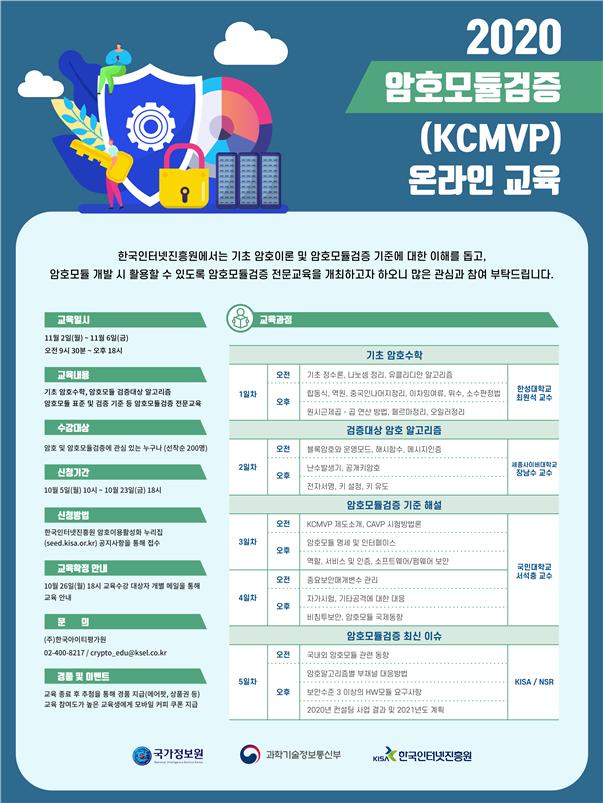 한국인터넷진흥원(이하 KISA)은 국가정보원, 과학기술정보통신부와 함께 암호모듈검증 시장 활성화와 전문인력 양성을 위한 ‘2020 암호모듈검증 전문교육’을 오는 11월 2일부터 11월 6일까지 5일 동안 온라인으로 실시한다고 밝혔다.