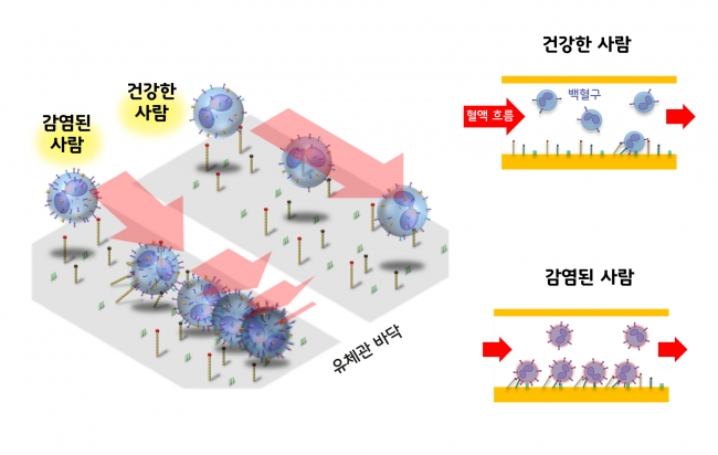 연구팀은 면역세포(백혈구)가 감염이 발생된 부위로 이동하기 위해 혈관 내벽을 통과(혈관외유출)하는 과정에서 혈관 내벽에 붙는 현상을 모방했다. 개발한 칩의 유체 관 벽면에는 감염 시 혈관 내피세포가 발현하는 단백질이 코팅돼 있다. 이 단백질은 혈액 속을 떠다니는 백혈구를 붙잡는 역할을 한다. 환자의 백혈구 표면에서도 혈관 내벽 단백질과 짝을 이루는 단백질 발현이 증가할 뿐만 아니라 이러한 백혈구의 비율이 높아진다. 이 때문에 환자의 혈액을 미세 유체 관에 흘렸을 경우, 유체 관 벽면에 달라붙는 백혈구 숫자가 건강한 사람에 비해 훨씬 많다.