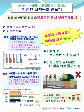 이에 서구는 ‘걸을 때 안전을 위해 스마트폰은 잠시 넣어주세요’라는 주제로 반상회 홍보자료 배포, LED 전광판 표출 등 안전한 보행문화 확립을 위한 홍보 활동에 나선다.