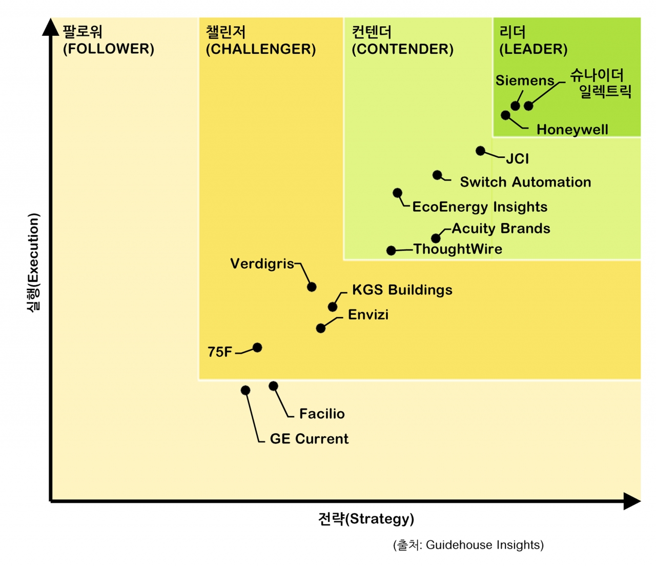 [테크월드=김경한 기자] 슈나이더 일렉트릭이 시장조사업체 가이드 하우스 인사이트(Guidehouse Insight, 구 내비건트 리서치)가 주관하는 지능형 빌딩 관리 소프트웨어 기업 평가에서 기술, 비전, 솔루션 측면에서 주요 기업으로 선정되며 1위를 차지했다.