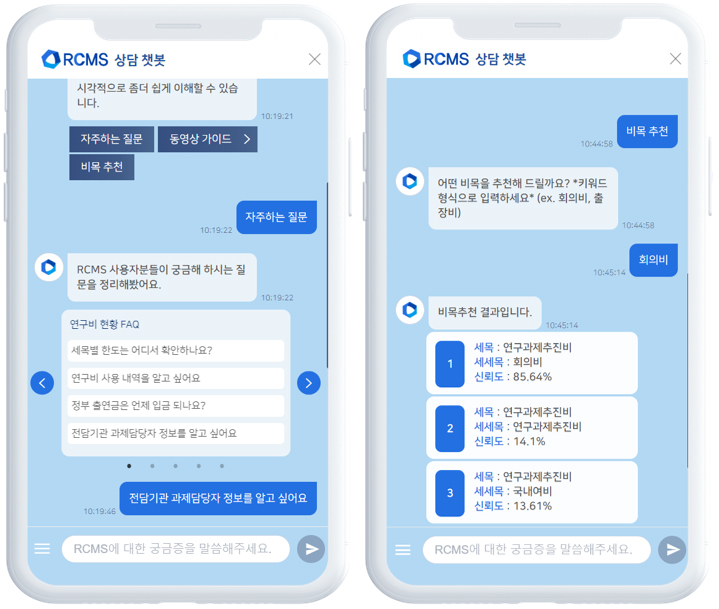 사용자의 올바른 연구비 사용을 목표로 △24시간 무중단 고객 응대를 위한 챗봇 서비스 △편리한 연구비 사용을 위한 비목 추천 서비스 △부정적 연구비 사용 예방을 위한 탐지모형을 제공해 기존 RCMS사용자와 담당자의 불편 사항을 해소한 것이 이 사업의 특징이다.