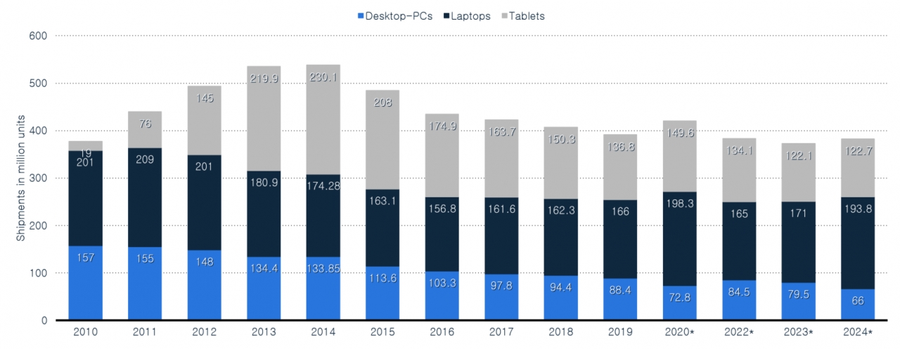 [테크월드=김경한 기자] 2020년에는 약 7300만 대의 데스크톱 PC가 전 세계적으로 출하될 것으로 예상되며, 2억 대에 가까운 노트북이 출하될 예정이다. 태블릿 출하량은 2020년 1억 5000만대에 육박할 것으로 예상된다.