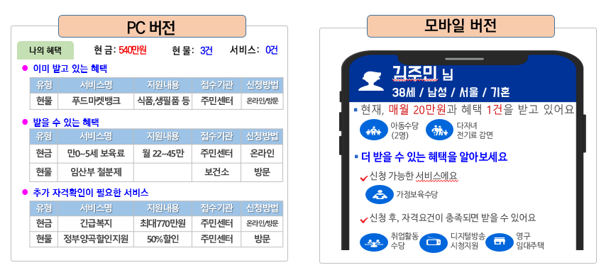 그동안 정부에서 지급하는 보조금 정보를 알기 위해서는 주민센터를 방문하거나 기관의 웹사이트를 일일이 접속해야 했지만, 서비스가 개통되면 불편함이 크게 해소될 것으로 기대된다.