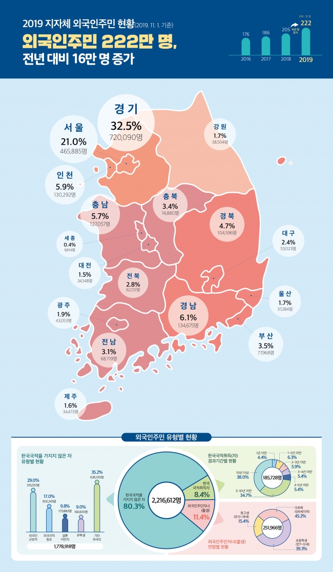 행정안전부(이하 행안부)가 통계청의 인구주택총조사 자료를 활용해 발표한 ‘2019 지방자치단체 외국인주민 현황(2019.11.1. 기준)’에 따르면, 우리나라에 거주하는 한국국적을 가지지 않은 자‧한국국적 취득자‧외국인주민 자녀(이하 외국인주민)는 모두 221만 6,612명인 것으로 조사됐다.