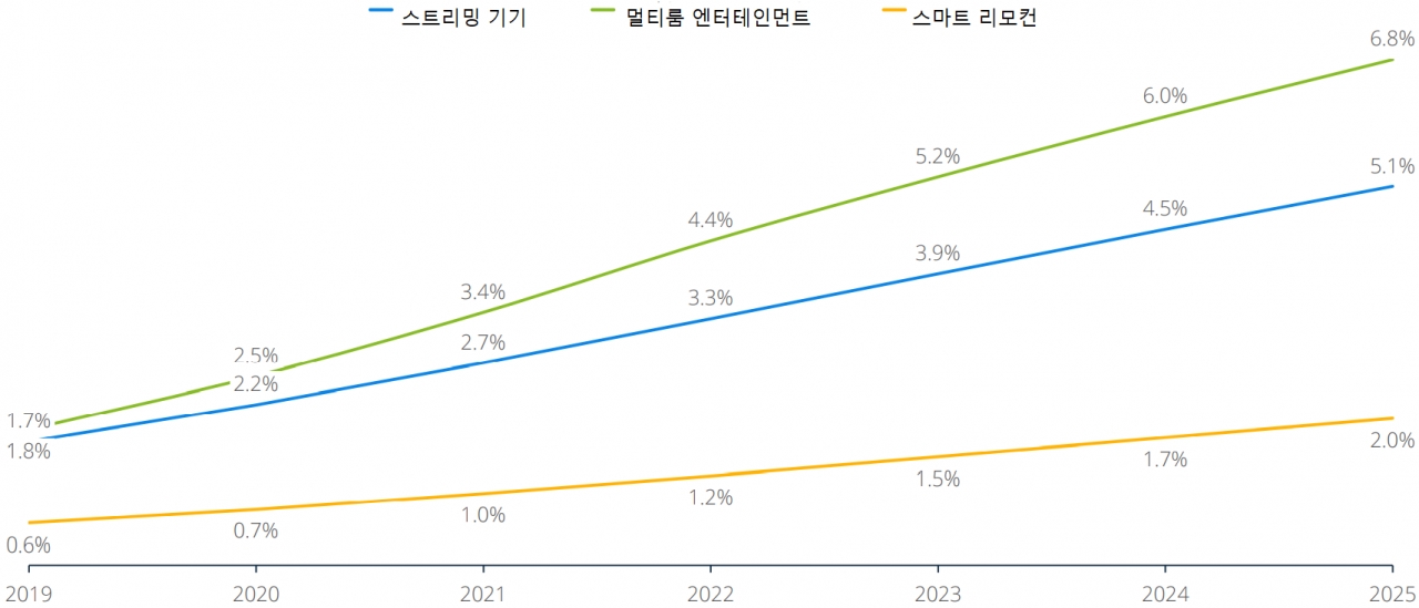 지난해 멀티룸 엔터테인먼트와 스트리밍 기기, 스마트 리모컨의 보급률은 각각 1.7%, 1.8%, 0.6%였다. 스태티스타에 따르면 올해 처음으로 멀티룸 엔터테인먼트가 스트리밍 기기의 보급률을 앞선다는 전망이다.