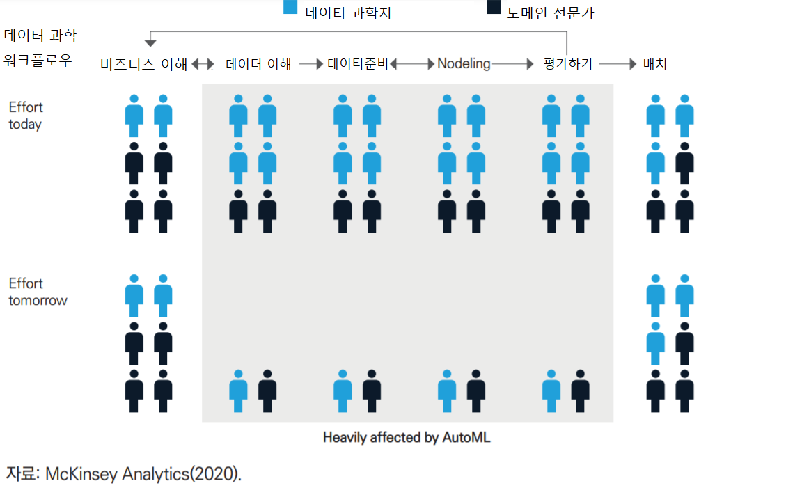 지난달 정보통신정책연구원은 ‘인공지능 기술발전이 인재양성 정책에 주는 시사점: AutoML의 사례’ 보고서에서 데이터 과학자에 대한 수요가 기존 예측보다 감소할 것이라고 내다봤다. 자동화된 머신러닝(AutoML)이 도입되면 최근 수년 동안 공급 부족을 겪고 있는 직업인 데이터 과학자에 대한 수요도 점차 줄어든다는 전망이다.