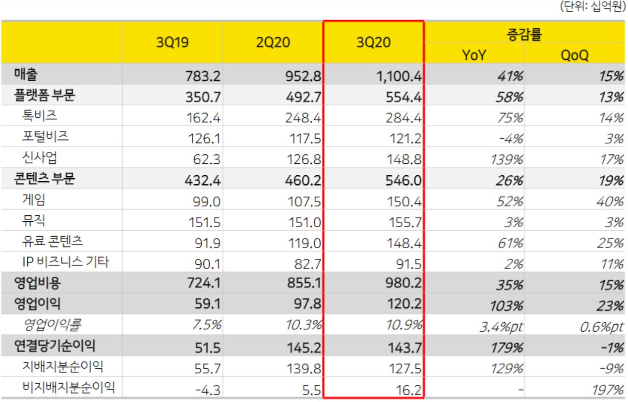 카카오는 5일 “3분기 잠정 매출(연결기준)이 작년 같은 기간보다 40.5% 증가한 1조1004억원을 기록했다”고 공시했다. 영업이익은 작년 동기 대비 103.5% 오른 1202억원을 기록했다. 매출은 14분기, 영업이익은 7분기 연속으로 역대 최대 기록을 경신했다.