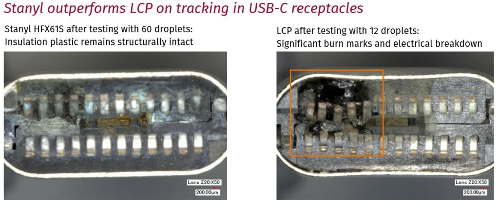 트래킹 저항 테스트에서도 스태닐이 LCP를 능가하는 것으로 나타났다. 각 소재로 만든 커넥터에 전류를 흘리고 소금물에 노출한 결과, LCP 커넥터는 12방울 만에 완전히 고장이 났고 스태닐은 60방울 후에도 약간의 부식만 보일 뿐 구조적 손상은 나타나지 않았다.