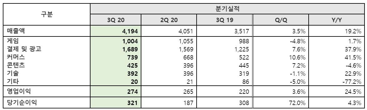 이에 3분기는 당사가 영위하는 사업 대부분이 계절적 비수기 국면임에도 불구하고, 비대면 시장 확대에 힘입어 결제 및 커머스 사업의 괄목할 만한 성과가 두드러지는 시기였다.
