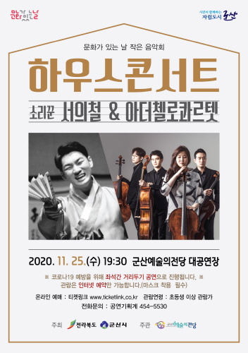 [테크월드=방제일 기자] 전북 군산예술의전당에서 늦가을의 정취를 물씬 느낄 수 있는 국악과 클래식의 콜라보 하우스 콘서트 '소리꾼 서의철&아더첼로콰르텟'의 무대를 오는 25일 오후 7시 30분 대공연장에 올린다.