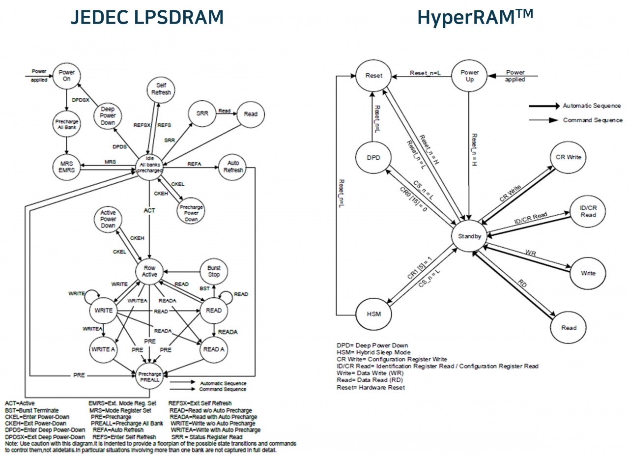 예를 들어, PS램 아키텍처에 기반한 하이퍼램은 셀프-리프레시(Self-refresh, 스스로 초기화되는) 램이다. 게다가, 자동으로 대기 모드로 돌아갈 수 있어 시스템 메모리를 더 쉽게 사용하도록 해주며, 펌웨어와 드라이버 개발 복잡성도 덜어준다.
