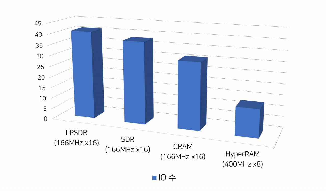 [그림 2]에서 보는 것과 같이 하이퍼램은 거의 비슷한 스루풋(333MB/s)을 달성하기 위해 저전력 D램, SD램, C램/PS램 등의 D램보다 더 적은 핀 수만으로도 충분하다.