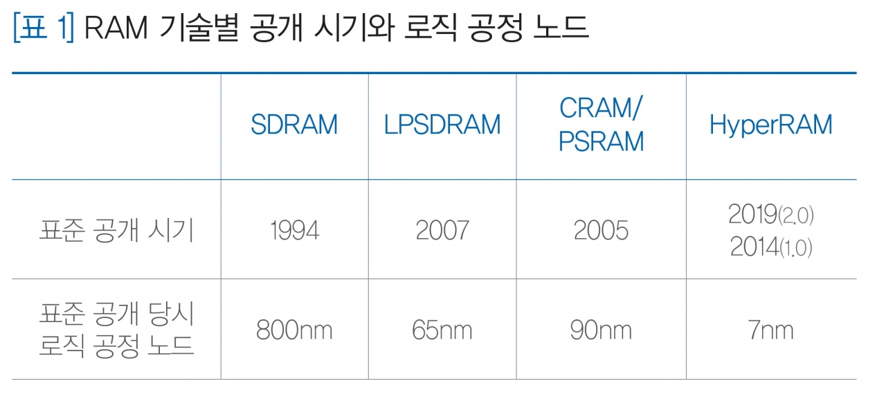 많은 MCU 공급 업체가 앞서 말한 것들을 고려해 더 높은 성능의 더 낮은 소비 전력을 갖는 차세대 MCU를 개발하고 있다. 전체 시스템 설계 관점에서 볼 때, MCU와 함께 작동하는 D램은 기존의 SD램, 저전력 SD램, C램/PS램보다 더 우수한 성능의 새로운 옵션이 요구되고 있다. 그러나 이런 D램의 표준은 이미 오래전에 정의됐기에 [표 1]과 같은 최신 기술을 발맞춰 따라갈 수 없었다.